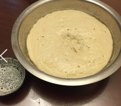 5. 待面团发至最初状态的2倍大时把盐碱用温水混合约15ml充分溶解后加入,揉匀,盖好,进行第二次饧发。