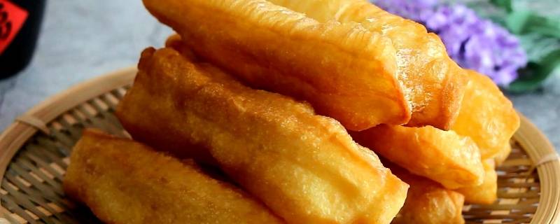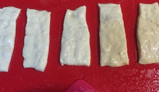 8. 分割面团,做油条剂子。用刮板先切约1/3面团出来,用手抹开整成长条状再用刮板快速分割成大小均匀的剂子。