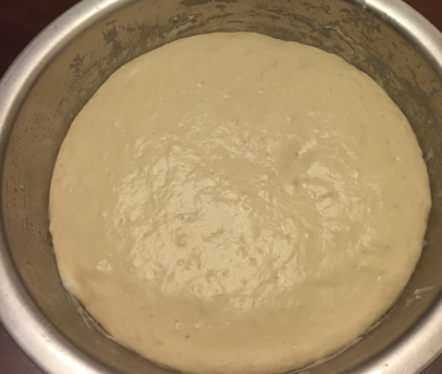 4. 最后加入食用油约15ml,因为面团稀软粘手,可以用刮刀翻拌,使面团表面光滑。盖上盖子或封上保鲜膜,进行第一次饧面。