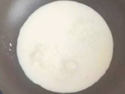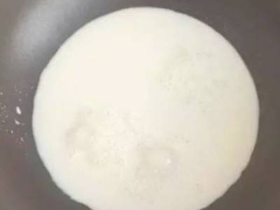 蛋液加入纯牛奶,小火慢慢加热,用勺子不停的搅拌。