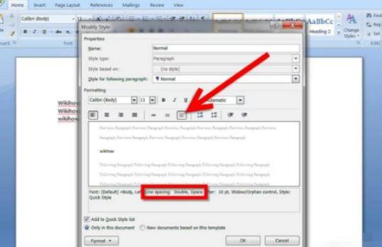 5. 在格式区域,点击双倍行距按钮对整篇文件进行设置,需要确保在预览区域下方的文字显示为“行距:2 倍行距”,按下确定保存设置。