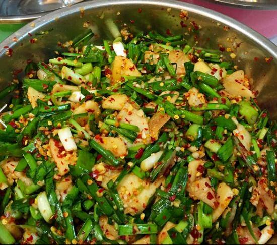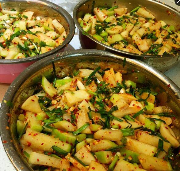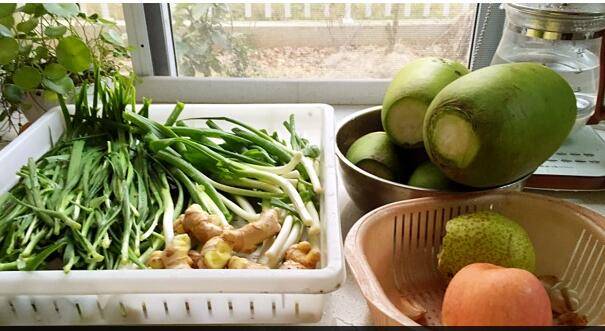 食材:青萝卜、韭菜、葱苹果、梨、姜、大蒜、盐、糖。