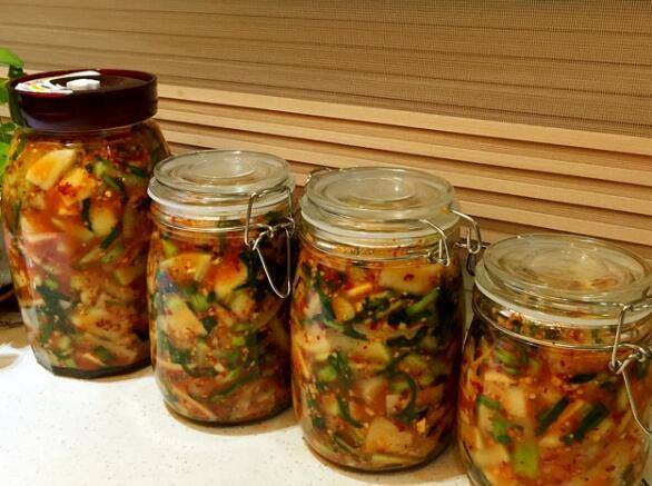 5. 把萝卜条均匀拌进上面配料里,然后直接装玻璃瓶,室温发酵一天或者一个晚上,然后放进冰箱里控制发酵。打开闻到酸味就可以吃了。