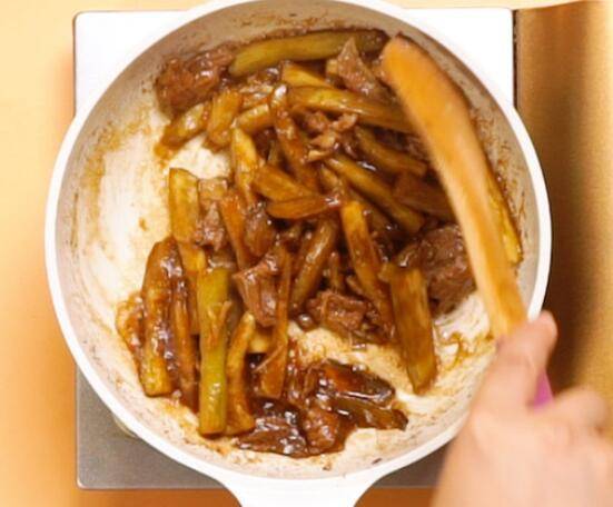 6. 倒入茄子、高汤,翻炒至茄子变软即可。