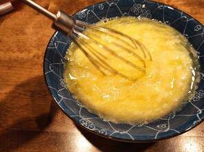 3. 加盐、水。水和蛋液的比例是1:1。搅匀蛋液和水。