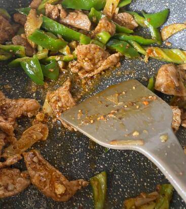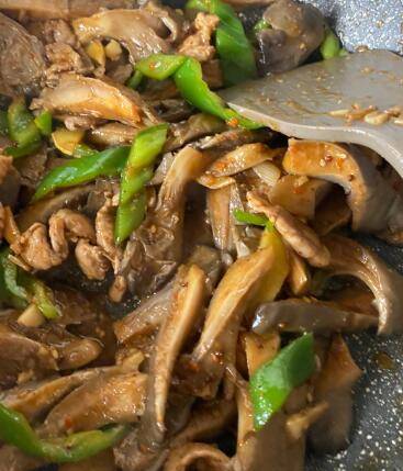 放入尖椒块炒至断生,放入平菇、生抽、蚝油、适量盐调味即可。