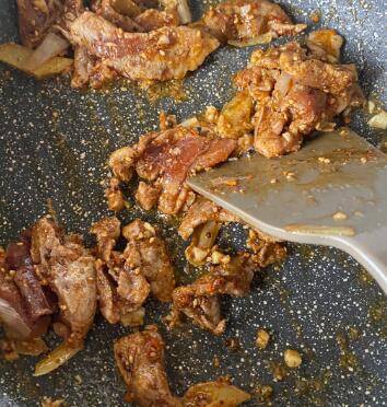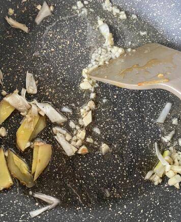 五花肉中放入生抽、淀粉、胡椒粉腌制片刻,锅中油热后放入蒜末姜片葱花五香粉炒香。