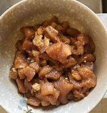 2. 猪肉切片,加入生粉、酱油腌制片刻。