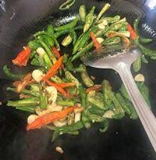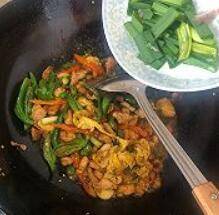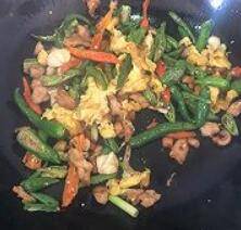 8. 锅中下油,倒入辣椒、大蒜炒香。