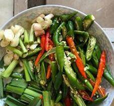 3. 准备大蒜、蒜叶、辣椒切好备用。
