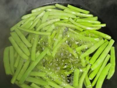 四季豆择茎洗净后清水下锅,放一勺盐,煮15分钟后捞出沥干。