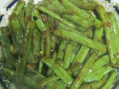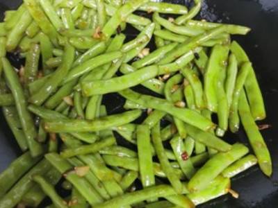 加入沥干的四季豆翻炒,再加生抽、豆瓣酱、盐、蚝油翻炒均匀。