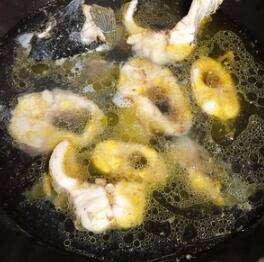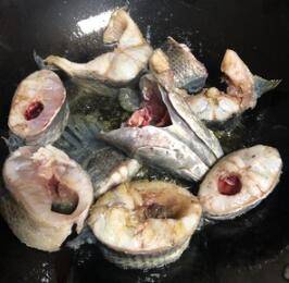 3. 油烧热后,转中小火,放入鱼块和姜片,鱼块慢慢煎到两面金黄。