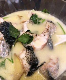 6. 碗底放入葱和香菜茎,将鱼块倒入碗中,放上香菜叶,最后倒入鱼汤即可。