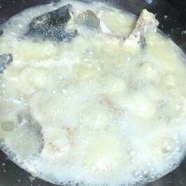 5. 煮沸以后慢慢小火煮,煮到鱼汤呈奶白色,放入一大勺盐,继续小火将汤煮至浓稠。