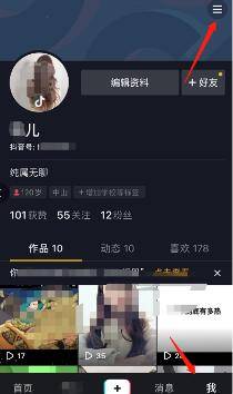 打开抖音,在“我”页面上,单击右上角的三个水平条。