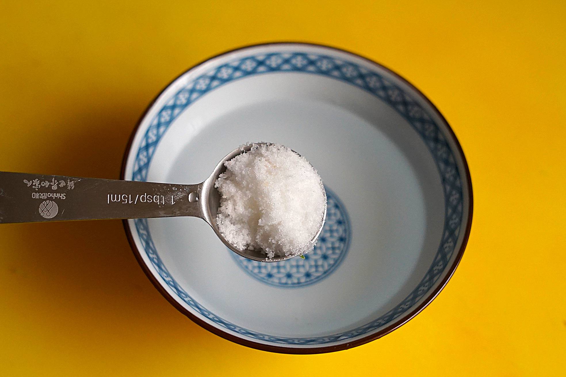 4. 准备一大碗温开水,放入2大勺盐然后搅拌均匀。