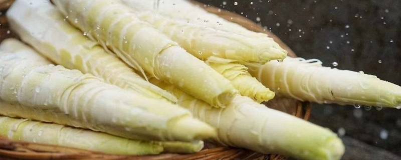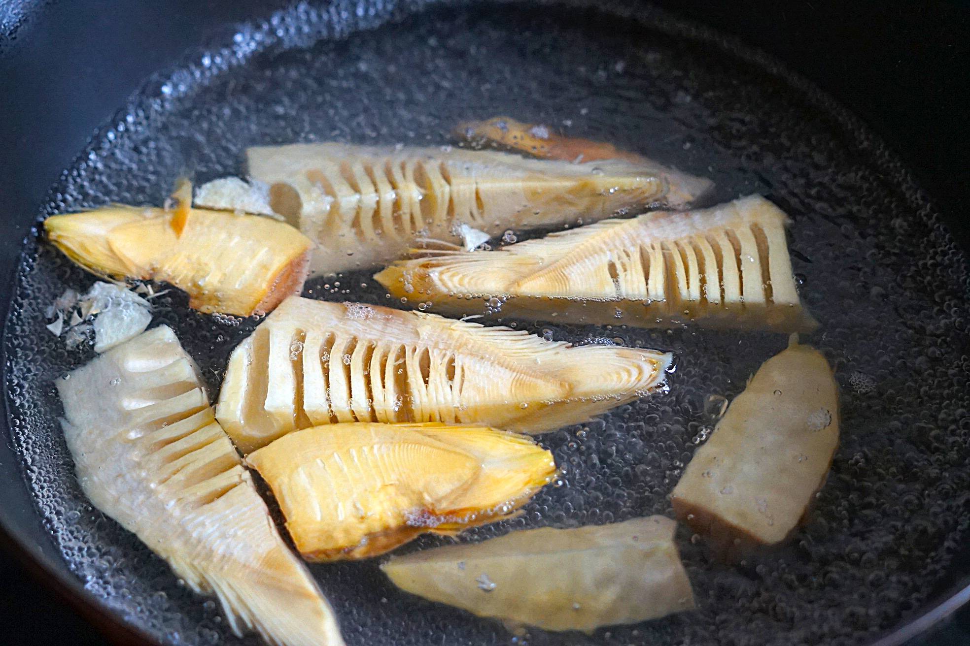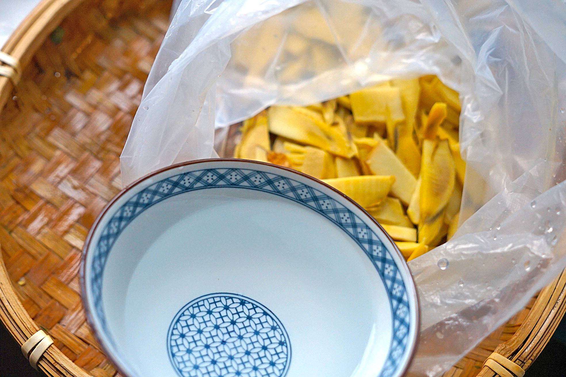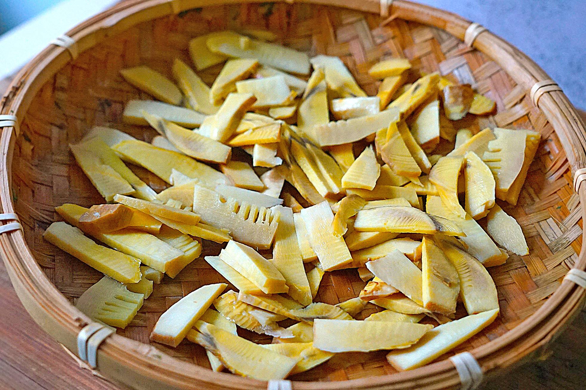 2. 锅中烧开水,煮开后滴入几滴油在锅中,然后放入春笋,焯水三四分钟后捞出来过凉水。