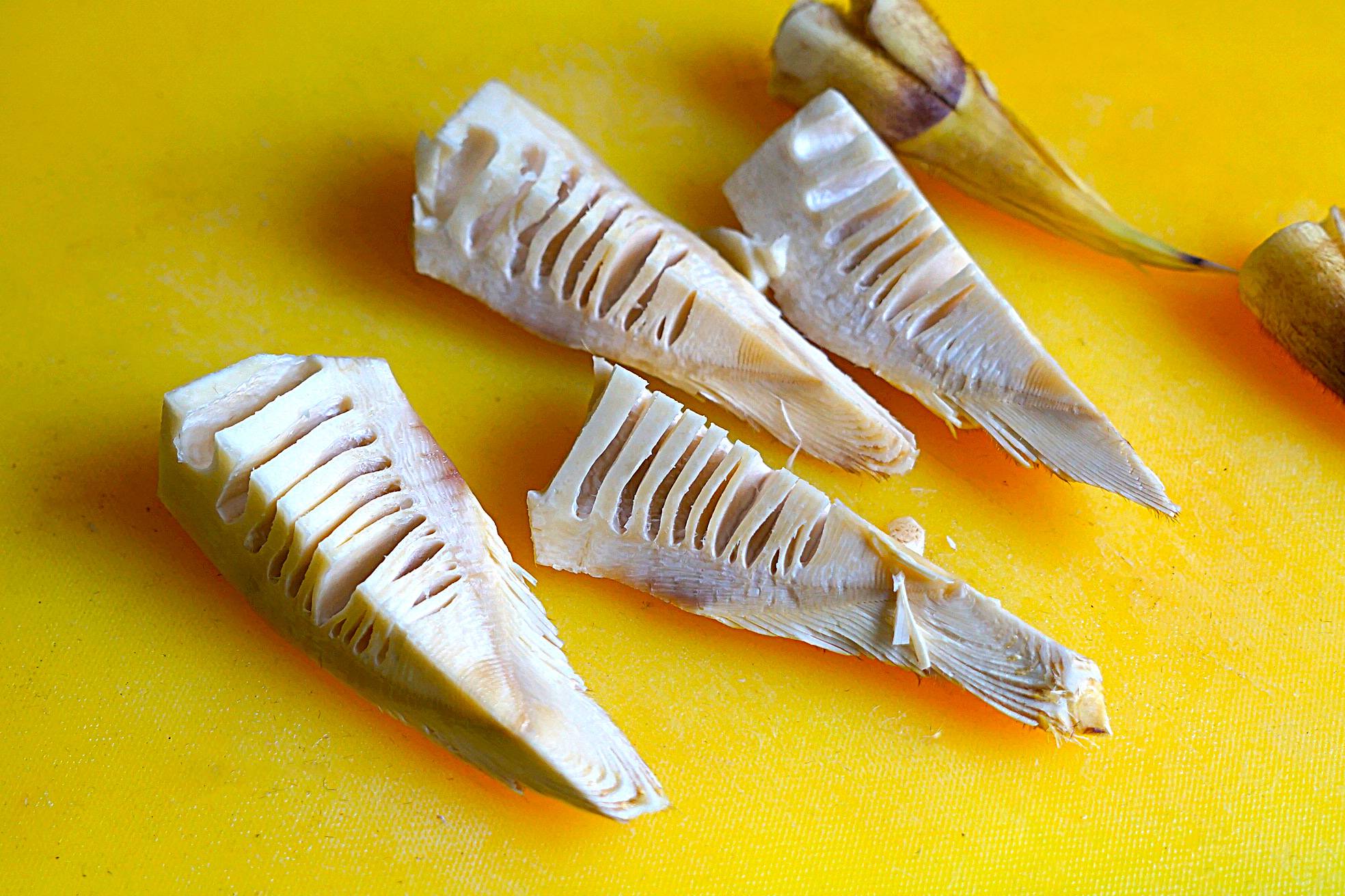 1. 先将春笋外皮剥去两三层,里面的用刀削整齐。