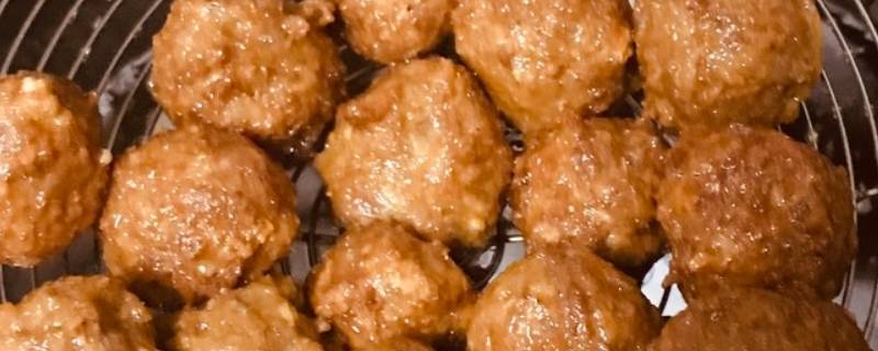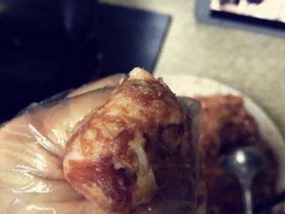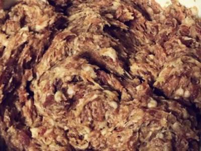 戴手套抓取一部分肉馅,不要太多,用虎口挤出一个肉丸。