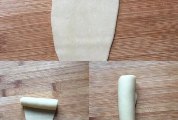 3. 把包好油皮虎口向下,擀成长条,在卷起来。盖上保鲜膜醒15分钟。醒发好,在擀成长条卷起来。