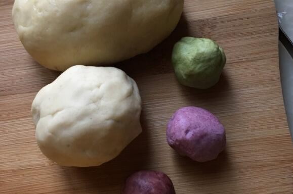 1. 油皮:高筋面粉,中筋面粉,绵白糖,猪油,水加一起和成面团,盖上保鲜膜醒1个小时,油酥:中筋面粉,猪油,加一起和成面团盖上保鲜膜。