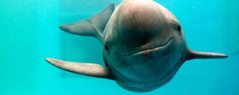 江豚全身铅灰色或灰白色。体长约125~190cm,体重100~220kg,头部钝圆,额部隆起稍向前凸起。江豚的头部较短,近似圆形,额部稍微向前凸出,吻部短而阔,上下颌几乎一样长,吻较短阔。牙齿短小,左右侧扁呈铲形。眼睛较小,很不明显。