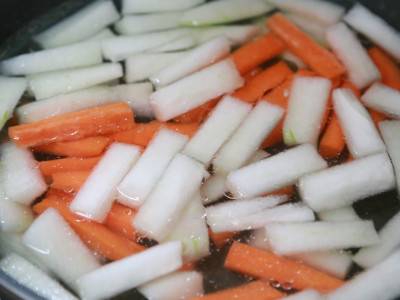 锅中烧水,水开后放入少许盐、油、冬瓜、胡萝卜,焯2分钟后捞出。