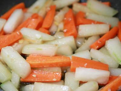 放冬瓜和胡萝卜,翻炒1分钟,加入蚝油、白胡椒粉、白糖、少许盐即可。
