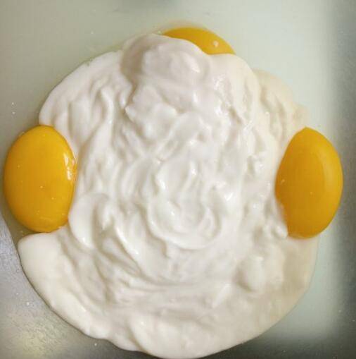 1. 蛋黄蛋白分开,蛋黄加入酸奶,搅拌均匀。