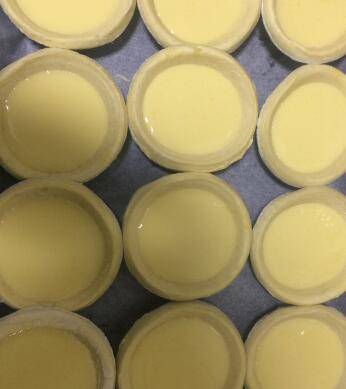 4. 将混合好的蛋挞液过筛,加入蛋挞皮8分满。