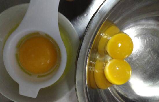 3. 另用容器,将鸡蛋黄打散,待牛奶液冷却,将蛋黄倒入奶液里搅匀。然后放入吉士粉搅匀。