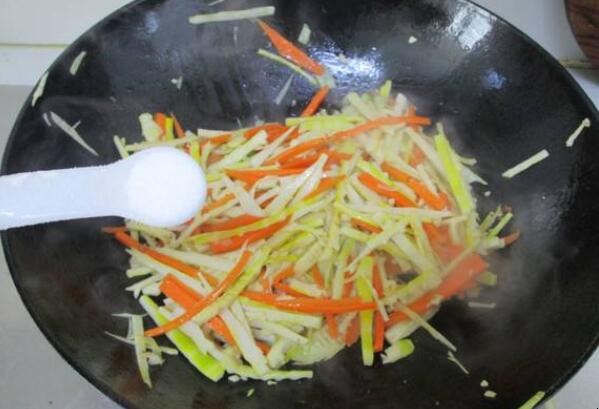 4. 锅内留油,倒入笋丝和胡萝卜煸炒至出香味加盐调味。
