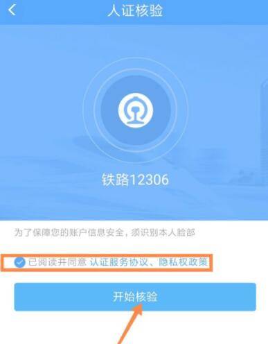 6. “人证核验”界面如下图所示,勾选方框处的同意协议,点击箭头处的“开始核验”。
