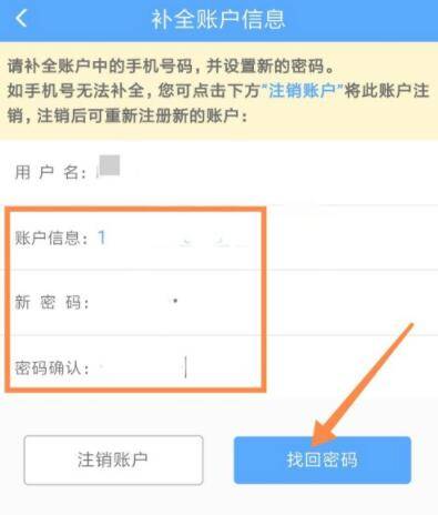 8. 下面开始“补全账户信息”,包含手机号、新密码等,点击箭头处“找回密码”即可。