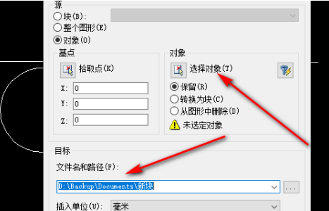 3. 确定命令后,弹出写块窗口,点击选择对象后,选择保存路径后点击确定即可。