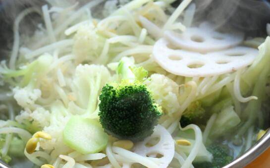 2. 花蛤洗净。莲藕、西兰花、黄豆芽、菜花绰烫一下,捞出来沥干水分待用。