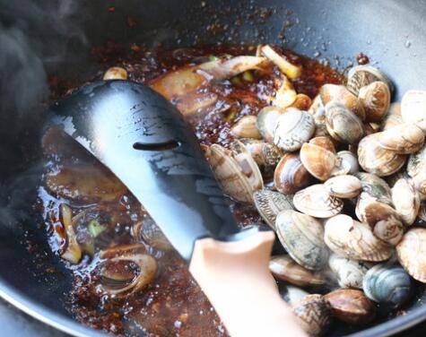 4. 放入香葱、姜、蒜、花蛤翻炒。