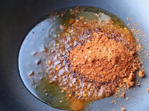 3. 炒锅放油烧热,放入麻辣香锅底料炒香。