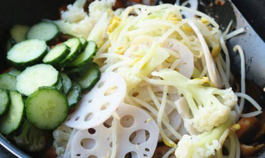 6. 加入上面煮好的蔬菜以及黄瓜片,继续翻炒。