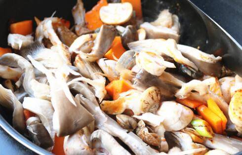 5. 再放入蘑菇和南瓜片继续翻炒。