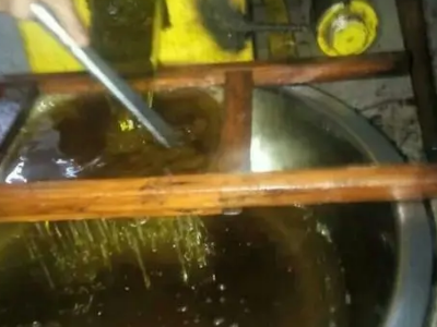 3. 将蒙好纱布的木框放置在油桶上面,将山茶油倒入木框中,等待充分过滤。