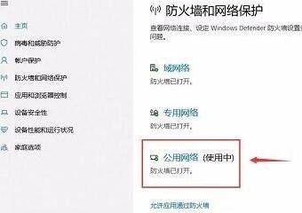 5. 这时可以看到有域网络、专用网络、公用网络这三个网络下方显示防火墙已打开。一般我们使用的是公用网络,所以在公用网络右侧显示使用中点击公用网络。