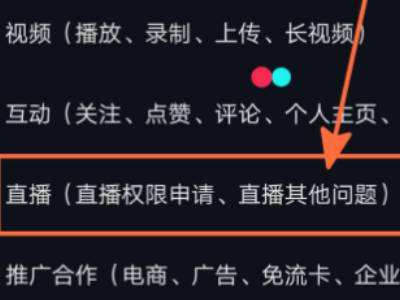 在“反馈与帮助”页面点击“直播(直播权限申请、直播其他问题)”选项。