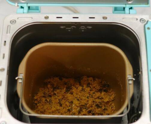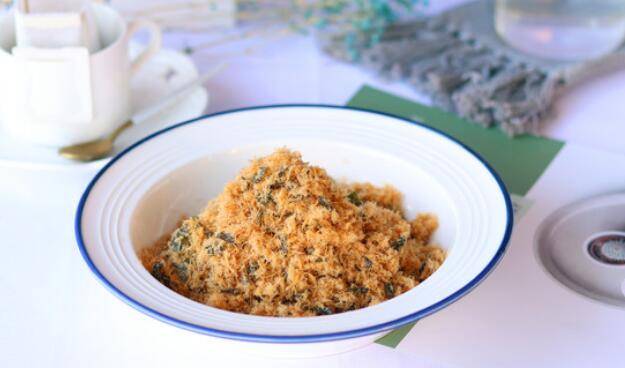 肉松炒至较干松散的加入海苔碎拌均匀。