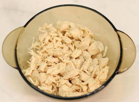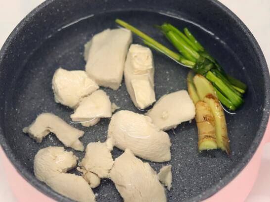 鸡胸肉剔除筋,切小块灼水,煮出泡沫后捞出鸡肉。