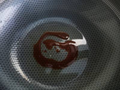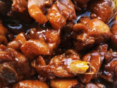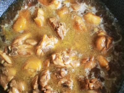 起锅放油、冰糖,小火熬至糖色,放入鸡块,翻炒至鸡块卷起加水。