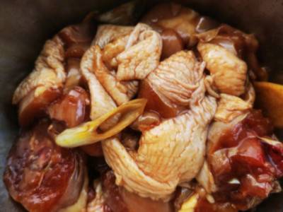 鸡腿剁成小块,葱姜切成小段,加入生抽、老抽、料酒、盐腌制半小时。