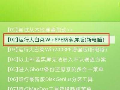 进入大白菜主菜单,选择02运行大白菜Win8PE防蓝屏版回车确认。