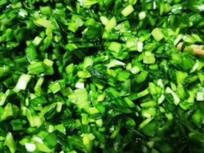 将韭菜切碎,放入十三香和油,搅拌均匀再放入食盐。